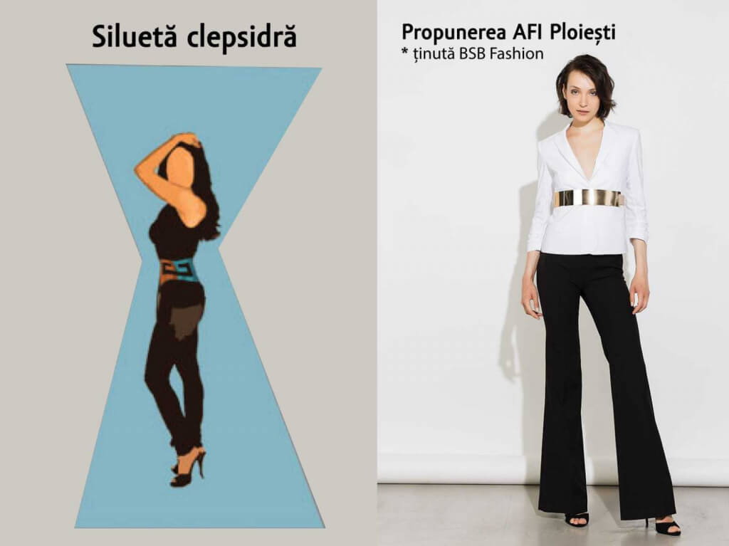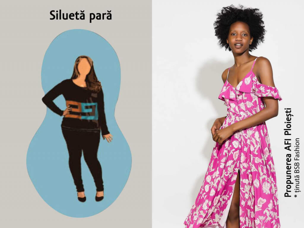 Exista patru tipuri de siluete: silueta tip para (triunghi), silueta clepsidra, silueta mar si silueta dreapta. Daca inca nu stii ce tip de silueta ai, poti afla asta masurandu-ti bustul, talia si soldurile, identificand astfel cele mai late parti ale corpului. Sau, varianta cea mai simpla, gandeste-te in ce parte a corpului te ingrasi.