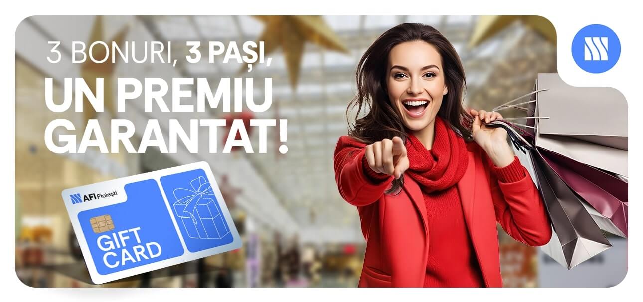 3 bonuri, 3 pași, un premiu garantat #doarlaafi! Cumpără de minimum 99 de lei, completează talonul la info desk cu încă două bonuri de minimum 99 de lei în decurs de o săptămână și câștigi garantat un AFI Gift Card în valoare de 50 de lei! Shopping, surprize și premii #doarlaafi! Detalii in regulament.