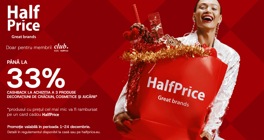 HALF PRICE: Pana la 33% cashback ramburs pe card cadou in Clubul HalfPrice.